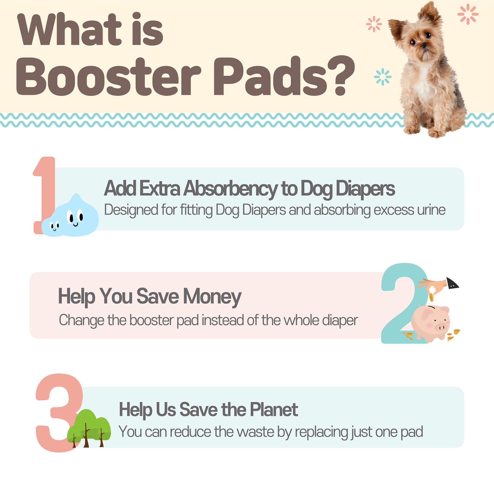 PREMIUM ABSORBENT TECHNOLOGY: The PAWPANG Booster Pads for male and female dogs contain the high-quality premium Super-Absorbent Polymer which turns moisture(urine) into gel and locks away moisture. Let's get away from the stress of worrying about leaks by adding extra absorbency to diapers (or male wraps, period panties and heat diapers).