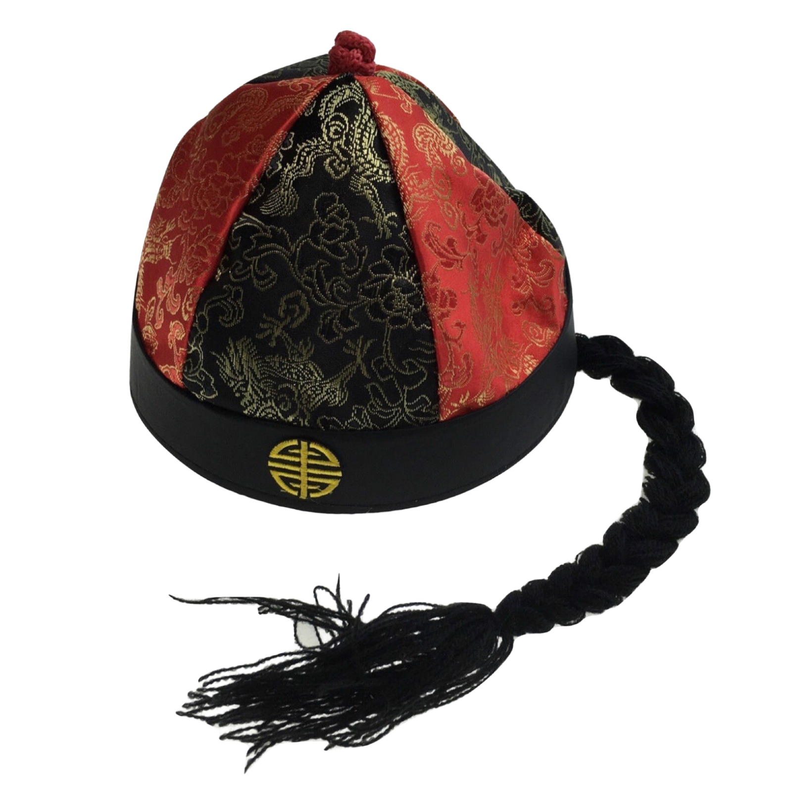 CHINESE LANDLORD HAT Oriental Asian Cap w Ponytail Party Costume Traditional - Black/Red