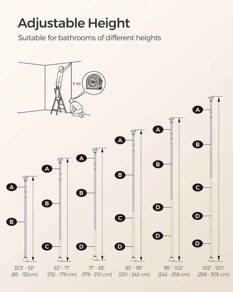 - [Fits Bathrooms of Various Heights] This floor-to-ceiling bathroom shelf is height-adjustable between 85-305 cm, allowing it to accommodate bathrooms of different heights